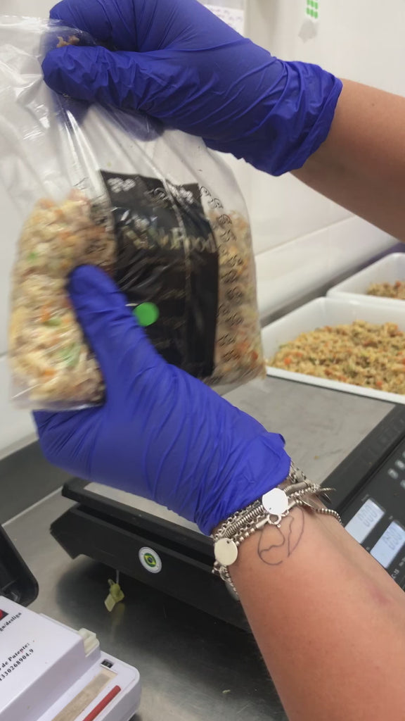 Composição: Abóbora, Batata, Chuchu, Brócolis, Repolho, Óleo de Canola, Farelo de Aveia, Carbonato de Cálcio, Carne Moída, Coração de Boi e Nutroplus suplemento.